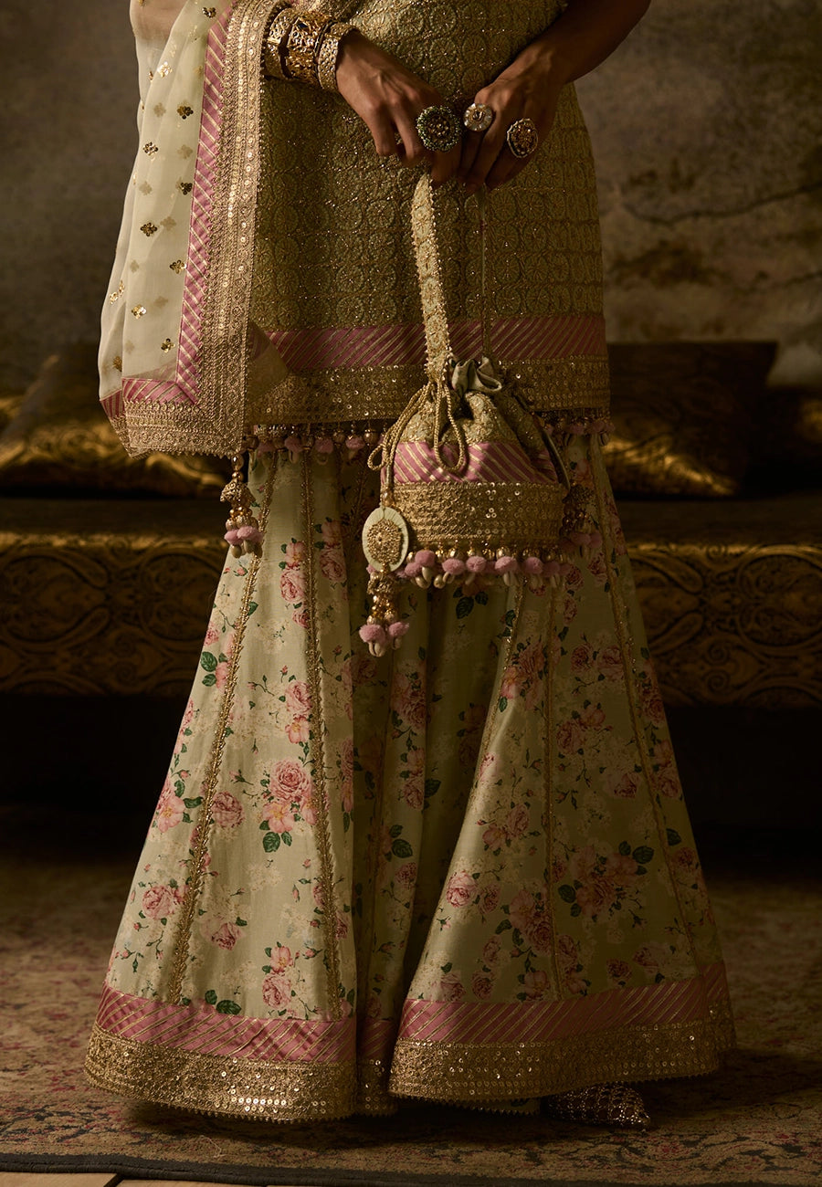 THE Chickenkari Kurta embellished with dori work, silk floral digital printed grara along with organza silk dupatta and teamed up with beautiful potli to complete the look crafted with love.